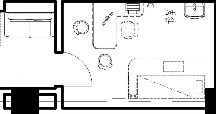 建議進(jìn)行標(biāo)準(zhǔn)化布置,以滿足基本診療的需求。向內(nèi)平開(kāi)門并靠深側(cè)墻,門方向深側(cè)墻對(duì)側(cè)設(shè)置診桌,診桌后方同側(cè)墻距離1米以外處布置洗手盆,防止水外濺腐蝕診桌。建議使用感應(yīng)式水龍頭設(shè)置,洗手盆下水管做U型彎方便檢修,洗手盆下做美觀的裝飾柜。水池上方30-50厘米以上貼墻梳妝鏡,保證門診醫(yī)生以良好的形象服務(wù)患者。檢查診床設(shè)置在洗手盆對(duì)側(cè)深側(cè)貼墻擺放,婦產(chǎn)科、耳鼻喉科、眼科等檢查床(椅)設(shè)備可布置在同側(cè),朝向可根據(jù)醫(yī)生診療習(xí)慣布置。檢查床必須設(shè)置隔簾,保護(hù)隱私。空調(diào)出風(fēng)口宜設(shè)置在診室門上,且側(cè)送風(fēng)為最佳,可避免直吹醫(yī)生或患者,且保證室內(nèi)空氣循環(huán)。